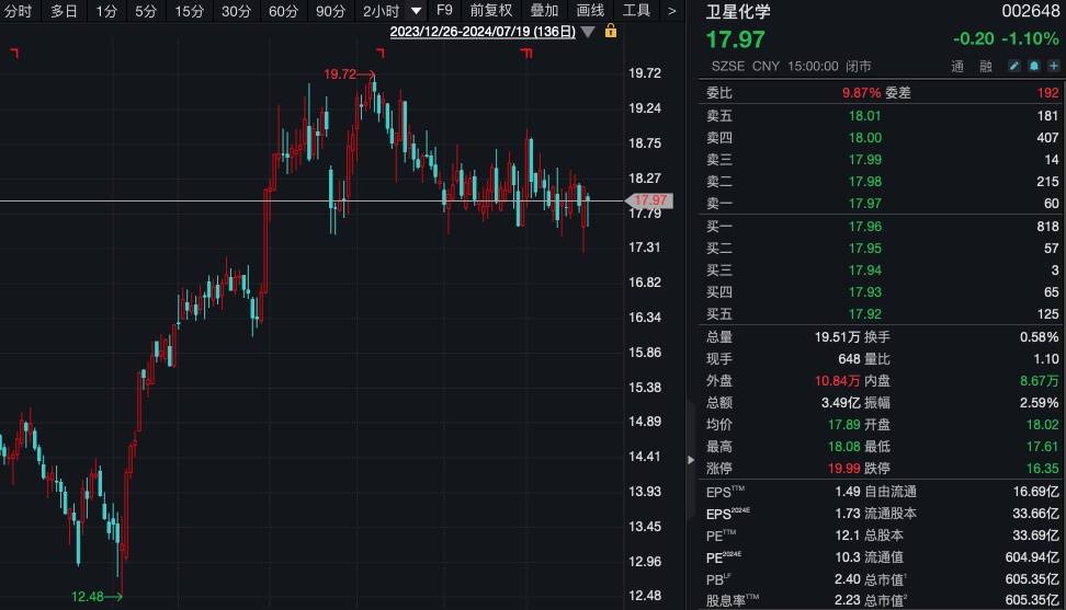 截至目前,卫星化学最新股价为17.97元/股,总市值约为605亿元。??