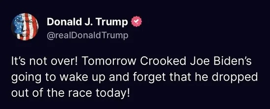 他在最新的回应中说:“还没有结束。狡诈的拜登明天一觉醒来就会忘记他今天退出了竞选!”