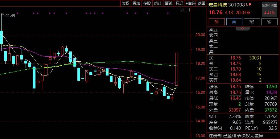 家用电器股早间大幅高开高走,板块指数跳空高开高走,盘中一度放量大涨逾5%,开盘仅半小时成交就超过昨日全天成交。鸿智科技一度触及30%涨停,北鼎股份、宏昌科技、火星人等多股直线20cm封板,海信家电(000921)、康盛股份(002418)、TCL智家等也批量涨停。