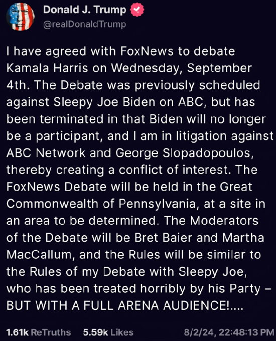 特朗普在Truth Social上发表的一篇贴文中表示,辩论将在宾夕法尼亚州举行,地点待定。