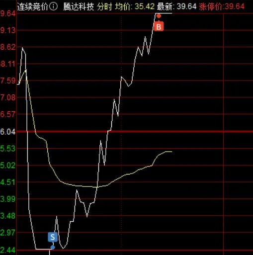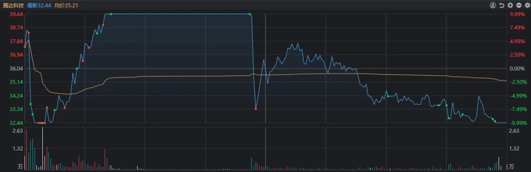 今天早盘,昨天走出11连板的大牛股腾达科技放量巨震,9:35跌停后于9:39翘板拉升,最终在10:10封住涨停板,但受大盘回落和高位股退潮影响,上午收盘前就炸板了;午后上攻无力,最终尾盘再度跌停。