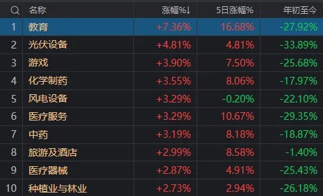 板块方面,教育、光伏、游戏、创新药等板块涨幅居前,保险、网约车、汽车整车、银行等板块跌幅居前。
