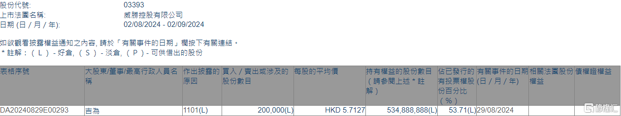 格隆汇9月2日丨根据联交所最新权益披露资料显示,2024年8月29日,威胜控股(03393.HK)获执行董事吉为在场内以每股均价5.7127港元增持20万股,涉资约114.25万港元。