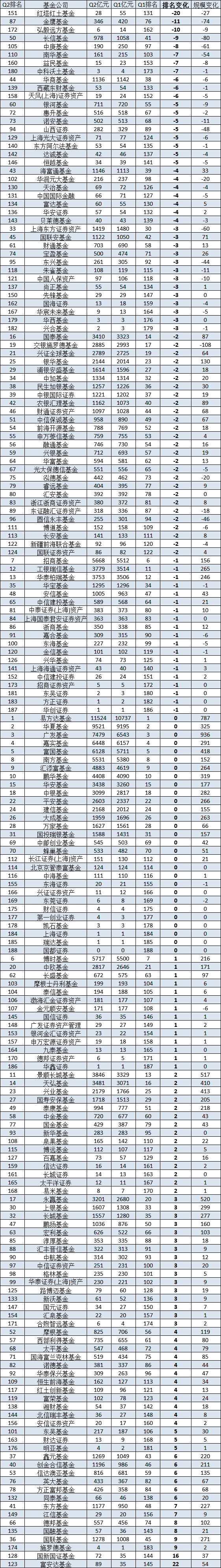 表:基金公司2024Q2非货规模名次降幅榜