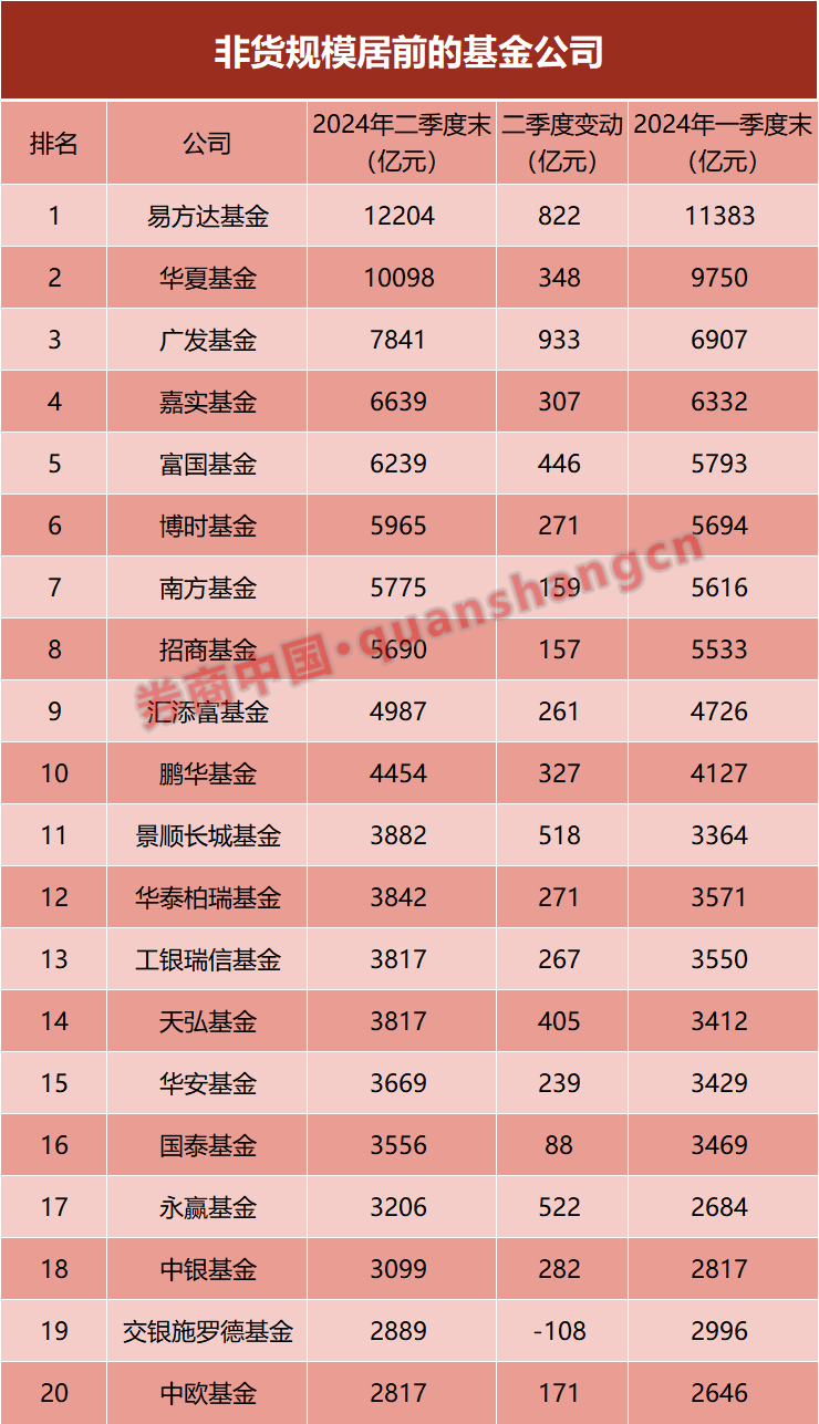 截至2024年二季度末,易方达基金、华夏基金、广发基金、嘉实基金、富国基金和博时基金的非货管理规模居前。