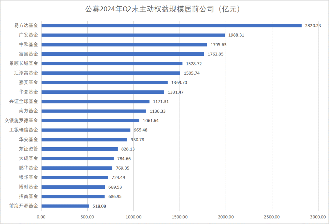 主动权益基金管理规模排名居前的公司有易方达基金、广发基金、中欧基金、富国基金和景顺长城基金,二季度末规模分别为2820.23亿元、1988.31亿元、1795.63亿元、1762.85亿元和1528.72亿元。