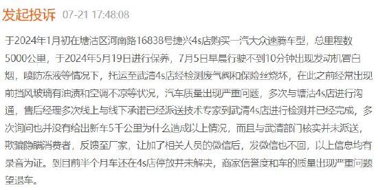 天津的何女士投诉称,2024年1月初自己在塘沽区一汽大众4s店购买了一辆速腾。5月19日,在公里数达到5000公里时进行保养。7月5日早晨在行驶过程中,车辆出现发动机冒白烟,喷防冻液等情况,且在此之前经常出现前挡风玻璃有油渍和空调不凉等状况。