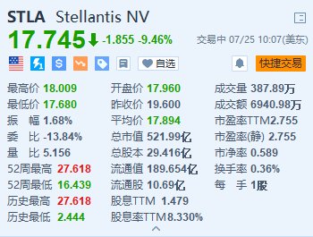 美股异动丨Stellantis跌超9.4% 上半年盈利跌48%逊预期 北美交付量减少18%
