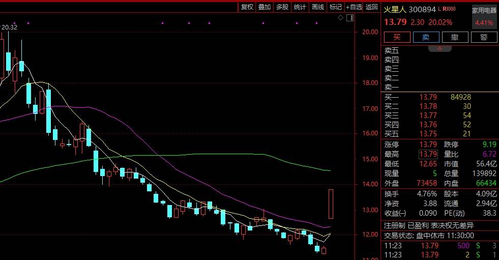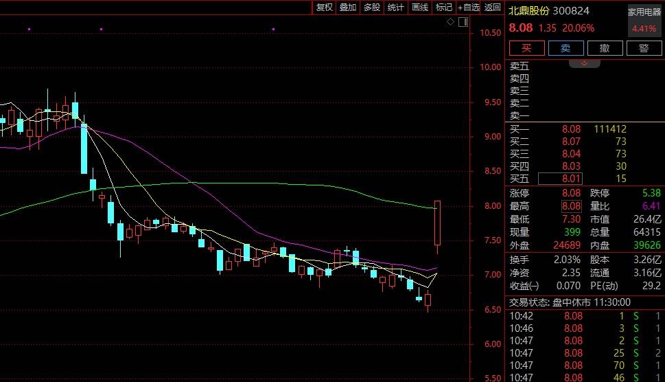 家用电器股早间大幅高开高走,板块指数跳空高开高走,盘中一度放量大涨逾5%,开盘仅半小时成交就超过昨日全天成交。鸿智科技一度触及30%涨停,北鼎股份、宏昌科技、火星人等多股直线20cm封板,海信家电(000921)、康盛股份(002418)、TCL智家等也批量涨停。