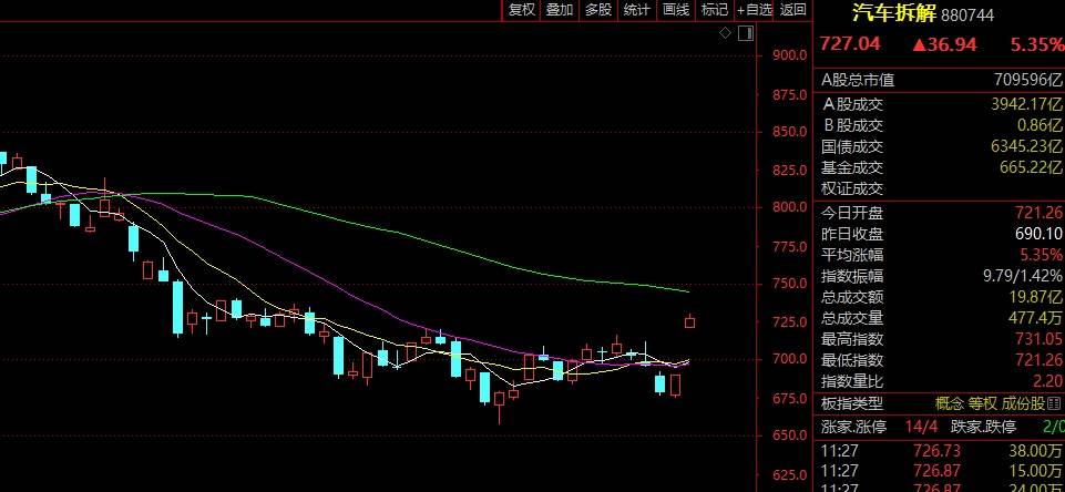 汽车产业早间也全线走强,汽车拆解概念领涨,板块指数盘中一度放量飙涨近6%,不到1小时成交就超过昨日全天成交。超越科技开盘20%一字涨停,华宏科技(002645)、交运股份(600676)、怡球资源(601388)等亦直线拉升快速涨停。