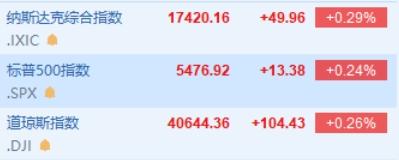 美股三大指数小幅高开,纳指涨0.29%,标普500指数涨0.24%,道指涨0.26%。