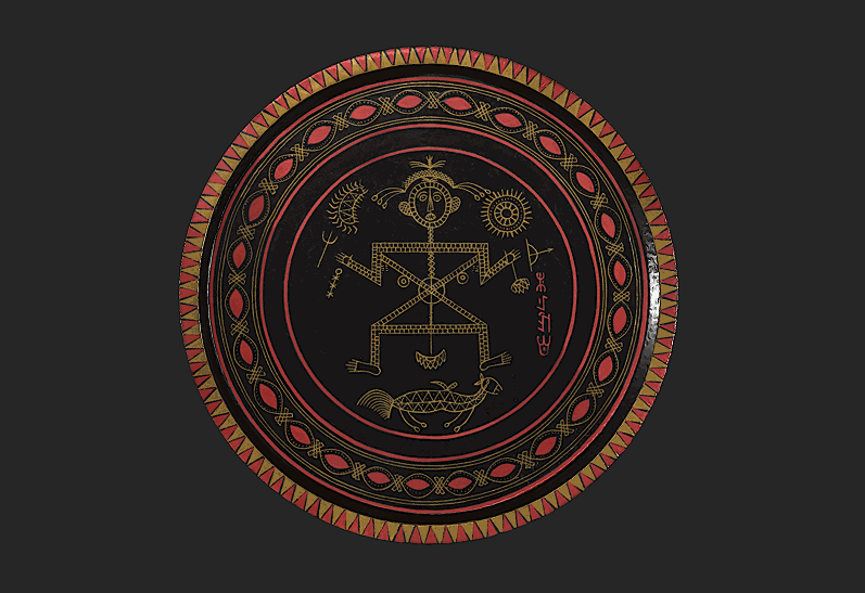 鸽形酒壶是彝族漆器中的经典器具,既可以作为装饰品,也可以用于装载酒液,表面纹路细节较复杂,主要由细密的鱼鳞纹和丰富的格纹绘制而成,壶身几何形状不规则、黑亮面较多。