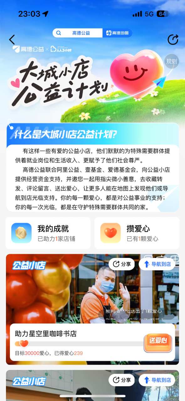据悉,高德地图也为广大爱心网友开设了公益行为互动页面,搜索【高德公益】即可进入页面,送出爱心、收藏转发、评论留言,导航到店,用指尖微小善意为店铺累积“爱心值”,帮助店铺解锁更多公益支持。