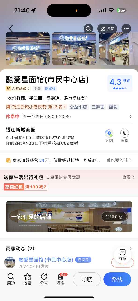 比如一位杭州的用户想吃面,在高德搜索后,“融爱星面馆”这家公益小店,在高德地图上就会有鲜明的“红飞机爱心”标记,用户去之前可通过公益小店页面对店铺有初步了解。网友还可以在公益小店地点详情页查看小店这些年做公益的初心和故事,让每个用户了解店铺做公益的初心,然后一键导航到达公益小店。