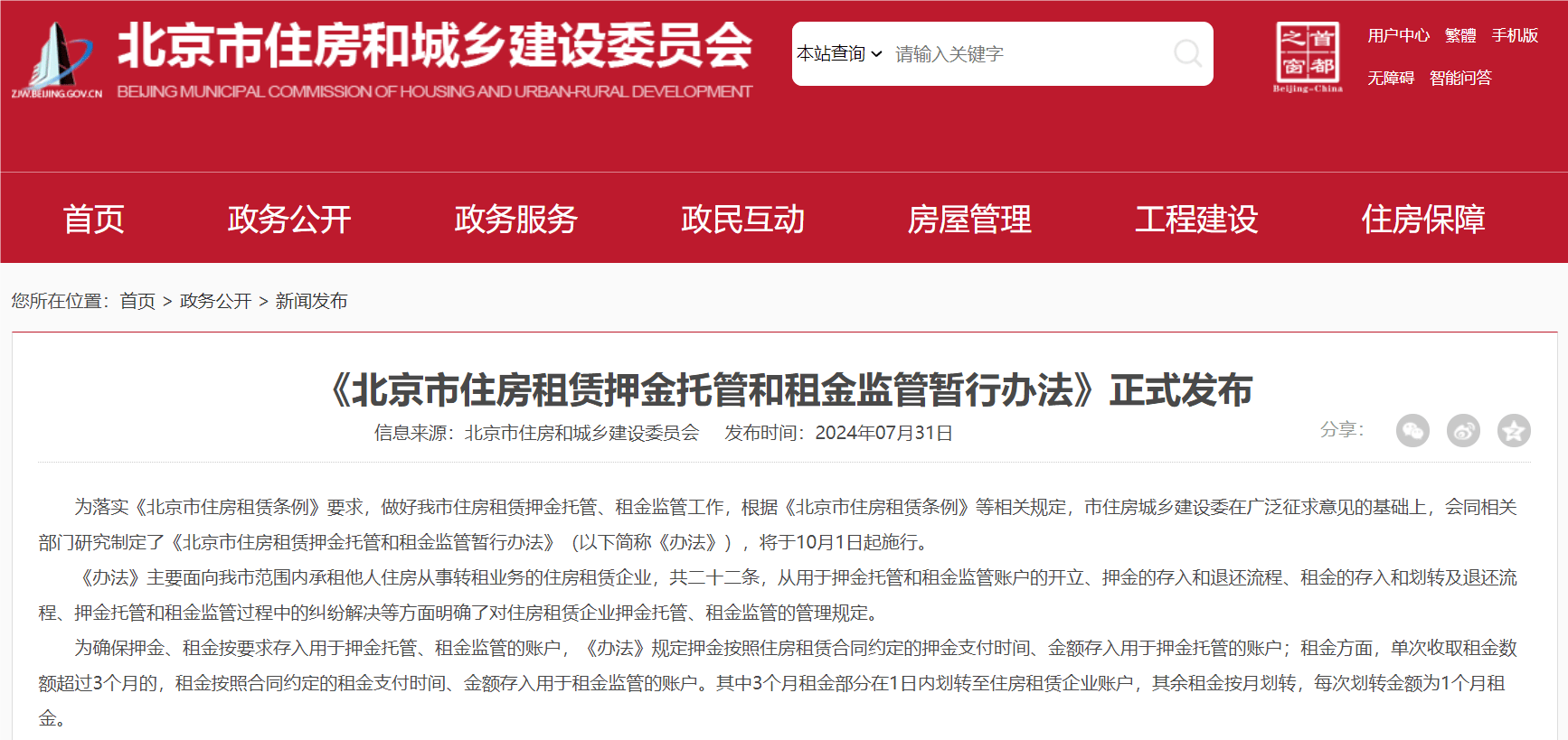 北京住房租金10月起将纳入监管账户,3个月以上租金需按月划转