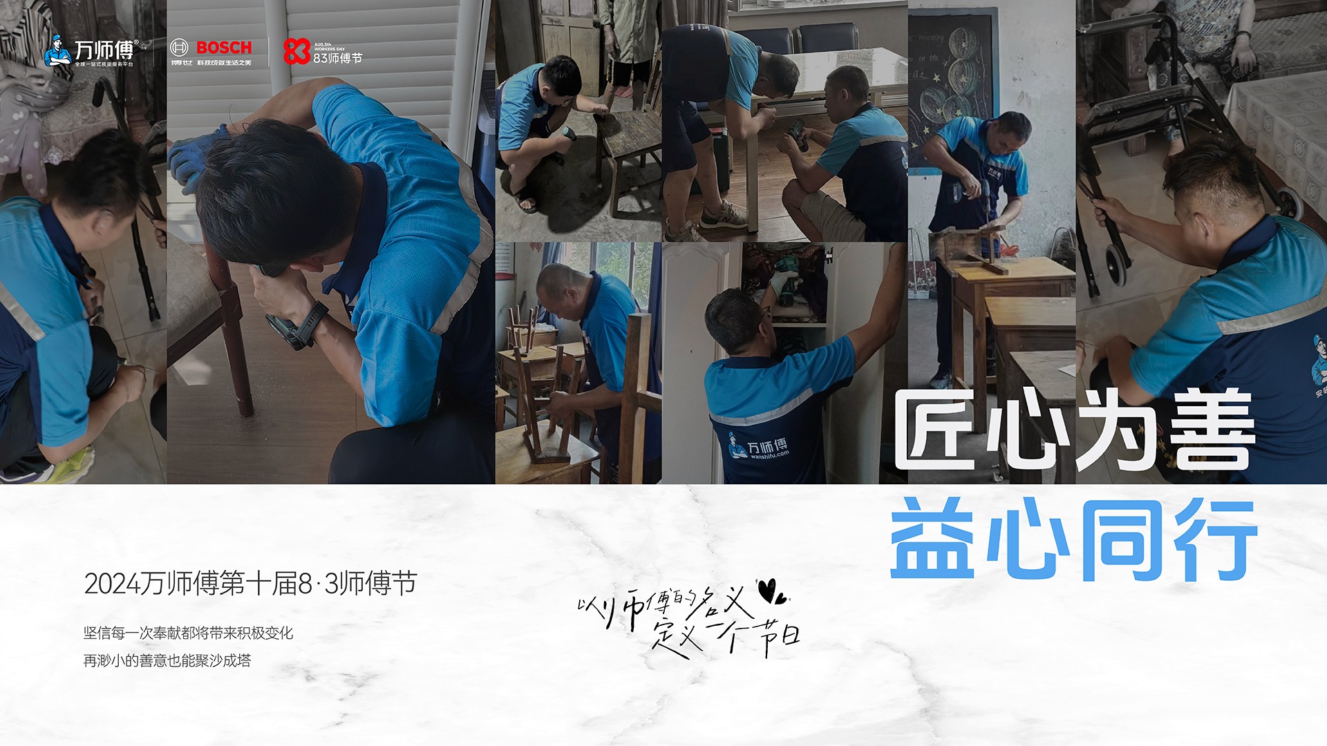 历史报道显示,2021年,第七届8・3师傅节公益行吸引上百支师傅团队热切参与,将爱心传递百城。自2019年师傅节公益行正式启动以来,万师傅平台累计组织师傅节公益行活动320余场,帮助各地福利院、养老院、学校等场所机构以及孤寡老人、贫困家庭进行家具义务修缮、安装和保养,鼓励师傅群体以一技之长传递善意。