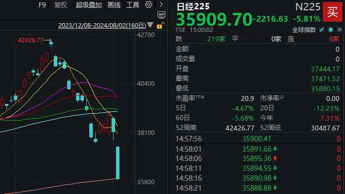 截至收盘,日经225指数跌近6%,创近半年来新低,自7月10日见顶以来,在不到1个月的时间里跌去近6000点,累计跌幅超14%。