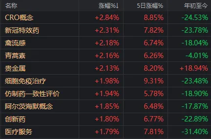 截至收盘,医药板块整体走强,占领涨幅榜。
