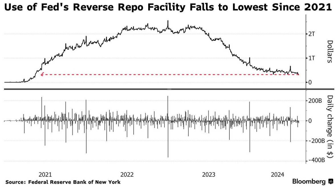 从 2023 年 6 月政府暂停债务上限到今年 4 月,美联储工具需求下降了约 1.8 万亿美元,原因是大量票据供应。当时,华尔街策略师预计RRP 将在 2024 年上半年完全耗尽。