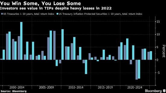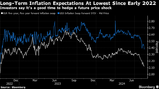 Royal London Asset Management Ltd.的基金经理Gareth Hill表示,他在通过5年期盈亏平衡通胀率在其投资组合中增加美国通胀风险敞口,即押注美国通胀保值国债(TIPS)将跑赢五年期名义国债。抛开大选因素,Hill仍认为这项交易会有价值,“对抗通胀的最后一英里是最难的。”
