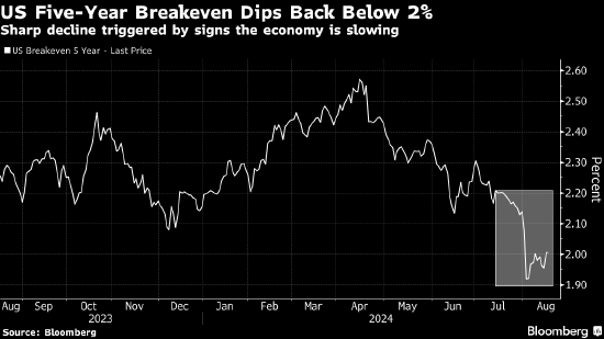 不过,许多投资者认为通胀指标降得太多。以美国5年期盈亏平衡通胀率为例,最近几周随着经济衰退担忧加剧,该指数大幅下跌,自2021年年初以来首次徘徊在2%附近。