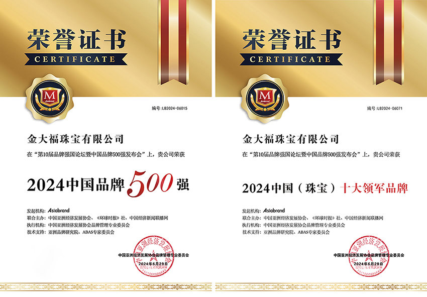近日,“第10届品牌强国论坛暨2024中国品牌500强发布会”在北京盛大举行,该活动由专业品牌评价机构 Asiabrand 发起主办,中国亚洲经济发展协会、环球时报社等联合举办。会上发布“2024中国品牌500强”榜单,金大福与华为、国家电网、腾讯等众多民族品牌一同上榜,并同时荣获“中国(珠宝)十大领军品牌”荣誉称号。这是对其综合实力、市场影响力和发展潜力的高度认可,也是对其品牌建设贡献的赞誉。
