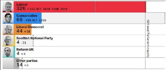 与此同时,保守党也面临着该党史上前所未有的惨败。国防大臣Grant Shapps等一些保守党重要人物丢掉了自己的席位。出口民调显示,保守党可能赢得131个席位。奈杰尔·法拉奇领导的民粹主义英国改革党从保守党手中夺走很多席位。