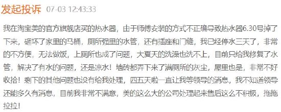 辽宁的王女士(化名)投诉到,自己2023年在电商平台购买了一台美的热水器,师傅上门安装。在2024年6月30日,热水器掉了下来,砸坏了墙里相连接的水管、马桶、还有插座和门框。由于水管损坏,王女士家停水多天,无法做饭,上厕所也成了问题。