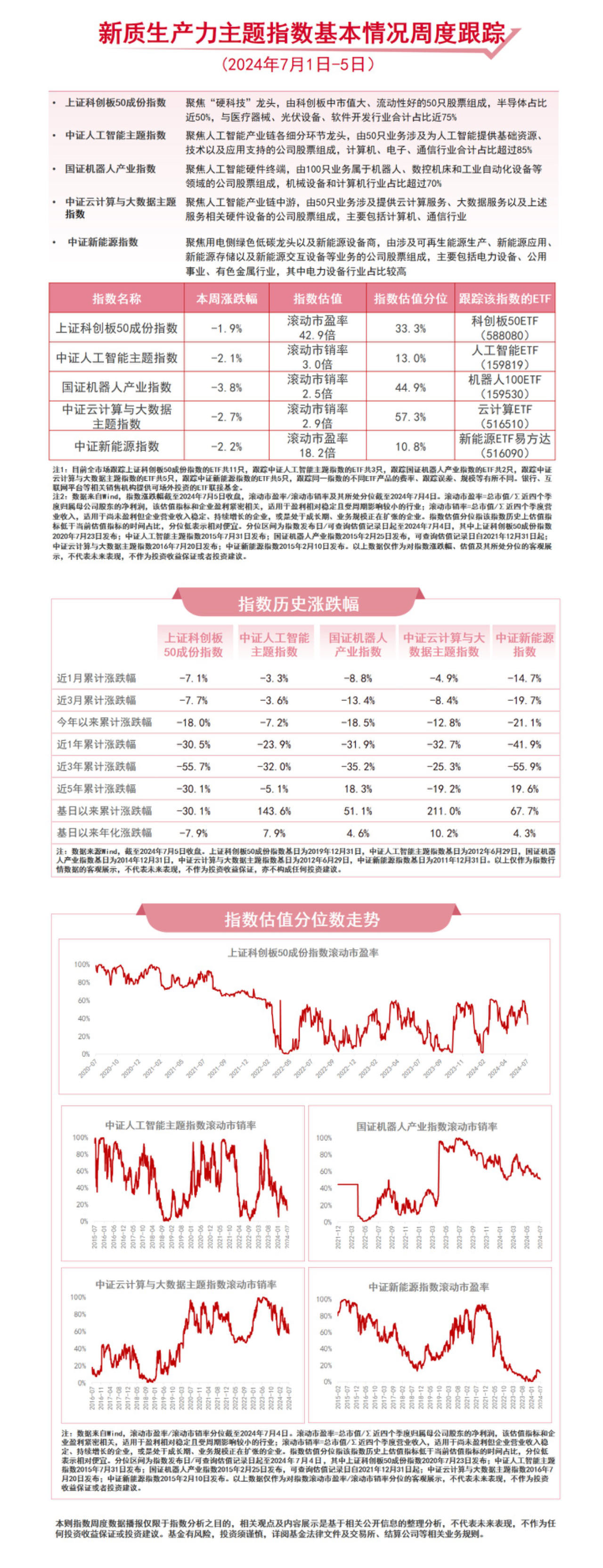 本周上证科创板50成份指数下跌1.9%,中证人工智能主题指数下跌2.1%,中证新能源指数下跌2.2%,中证云计算与大数据主题指数下跌2.7%,国证机器人(300024)产业指数下跌3.8%。