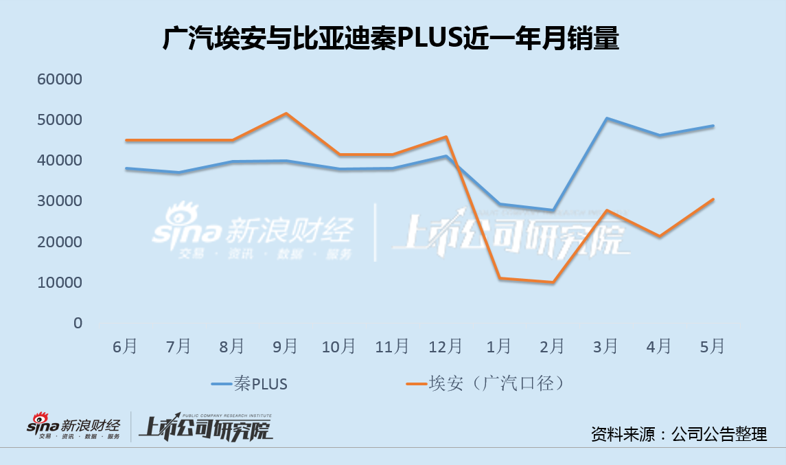以与埃安售价和销量比较接近的比亚迪秦PLUS为例。年初的价格战开始后,曾一度领先的埃安,销量立即被秦PLUS反超,此后月销量差距基本保持在2万台的较高水平。