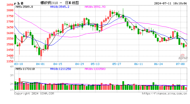 昨日螺纹盘面震荡下跌,再创本轮调整以来的新低,截止日盘螺纹2410合约收盘价格为3478元/吨,较上一交易日收盘价格下跌37元/吨,跌幅1.05%,持仓增加7.13万手。现货价格下跌,成交回升,唐山地区迁安普方坯价格下跌20元/吨至3260元/吨,杭州市场中天螺纹价格下跌30元/吨至3380元/吨,全国建材成交量9.97万吨。据钢谷网数据,本周全国建材产量回落7.2万吨至406.72万吨,社库增加8.85万吨至795.7万吨,厂库增加8.91万吨至402.02万吨,建材表需回落46.45万吨至388.96万吨。随着亏损钢厂增加,建材产量逐步回落,然而终端需求表现弱势,库存再次明显累积,表需明显回落,建材市场处于供需双弱局面。据中汽协数据,6月汽车产销分别完成250.7万辆和255.2万辆,同比分别下降2.1%和2.7%。汽车产销同比负增长,显示汽车行业用钢需求有所回落。预计短期螺纹盘面仍将偏弱运行。