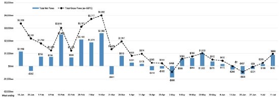 在全球最大加密货币的价格一周前跌至2月份以来的最低水平后,抄底买家大量回归,比特币交易所交易基金(ETF)迎来一个多月来的最大资金流入。摩根大通数据显示,截至7月11日当周比特币现货ETF净流入8.82亿美元,平均每天净流入1.75亿美元。这是截至5月23日当期以来的最大资金流入。贝莱德和富达的比特币基金领先,分别获得4.03亿美元和3.61亿美元流入。与此同时Grayscale的ETF继续流失资金,流出近8700万美元。