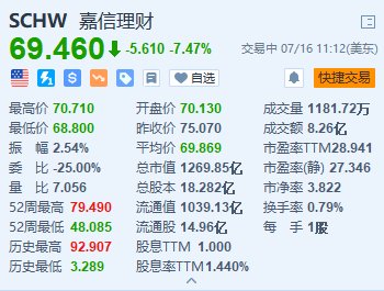 嘉信理财(SCHW.US)跌约7.5%,报69.46美元。消息面上,嘉信理财第二季度营收46.9亿美元,同比增长1%,分析师预期为46.8亿美元;每股收益为66美分,高于去年同期的每股64美分。然而,期内新增经纪账户数达98.5万,虽然高于去年同期的96万,但低于分析师预期的104万。