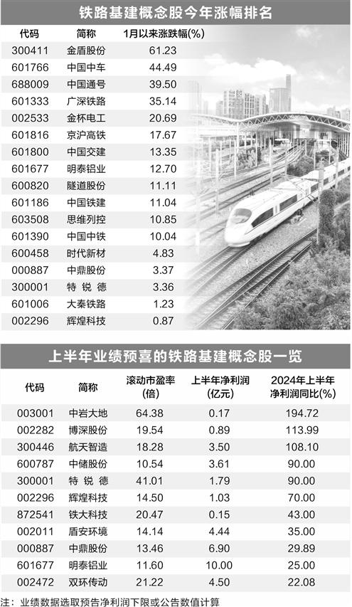 据证券时报・数据宝统计,截至7月17日收盘,今年以来铁路基建概念股整体上涨的股票不多,合计不到20只。涨幅最高的是金盾股份(300411),今年以来累计上涨61.23%,其产品已成功应用于郑万高铁等多个高铁项目。